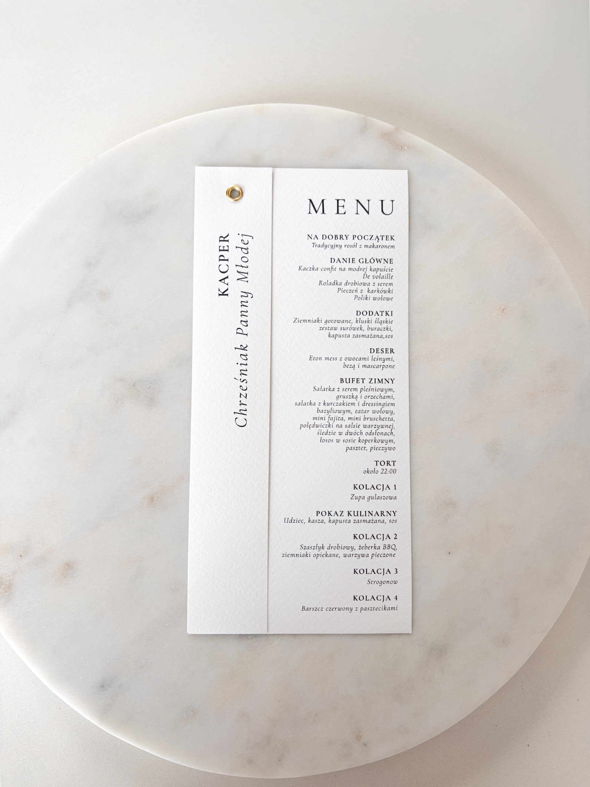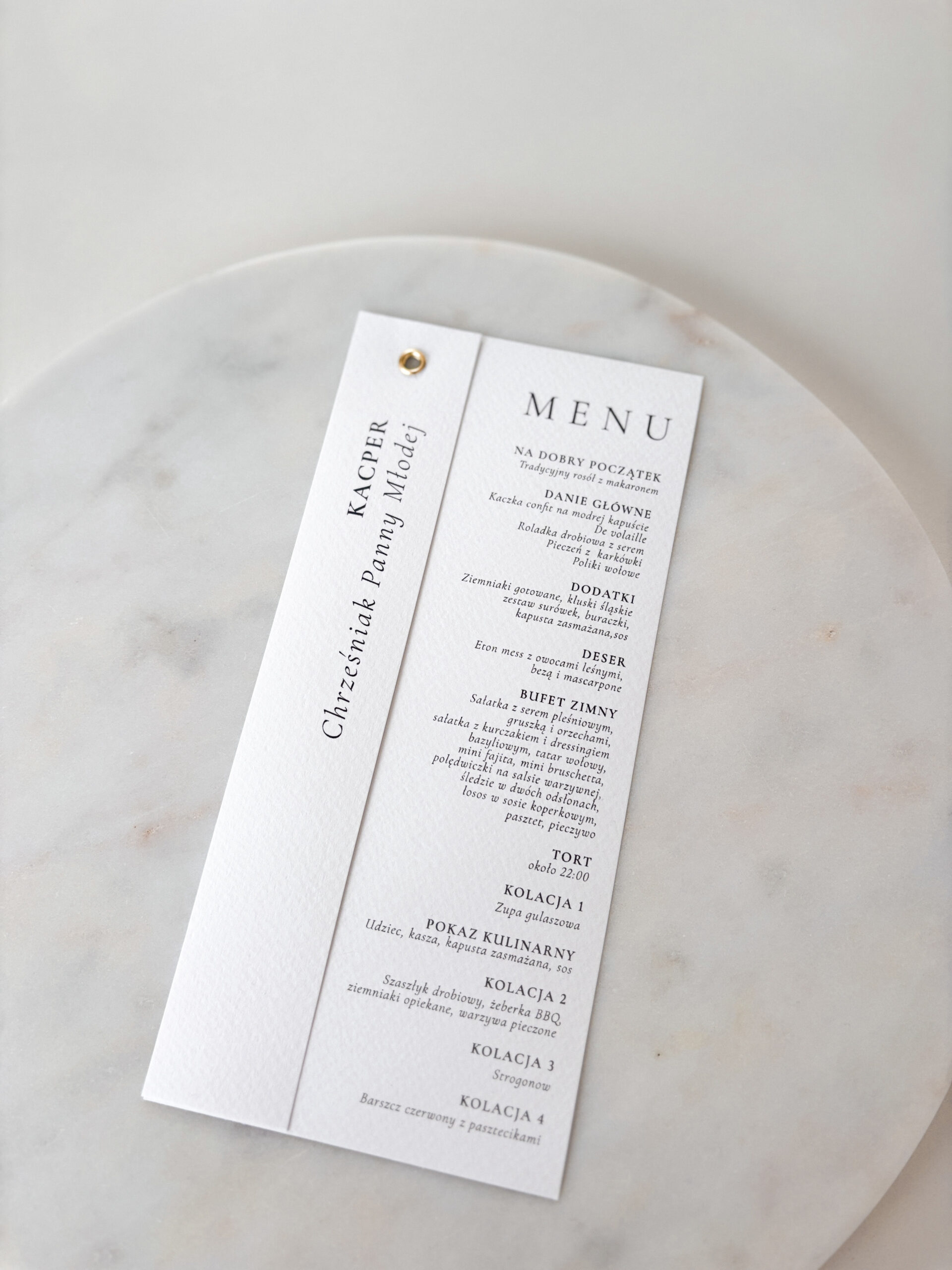 Zstaw menu i winietki w klasycznej bieli, wzbogacony subtelnym złotym detalem.