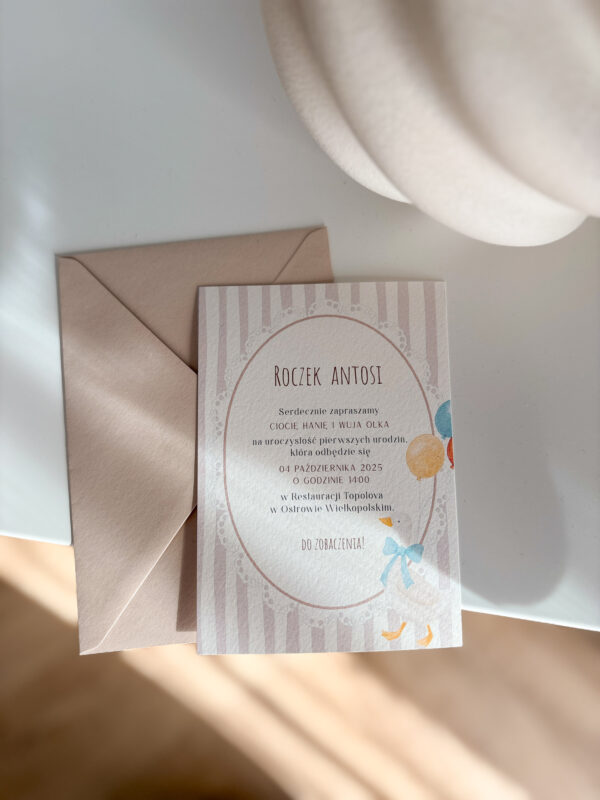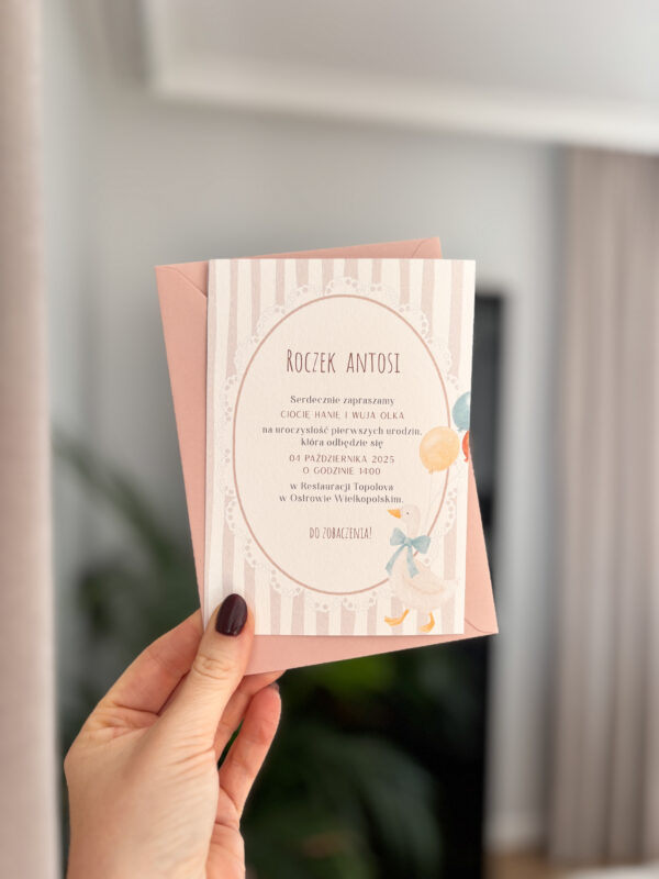 Urocze zaproszenie z motywem gąski trzymającej baloniki – pełne lekkości, radości i dziecięcego uroku. Subtelne pasy w tle oraz pastelowe kolory sprawiają, że doskonale nadaje się na roczek lub chrzest zarówno dziewczynki, jak i chłopca.