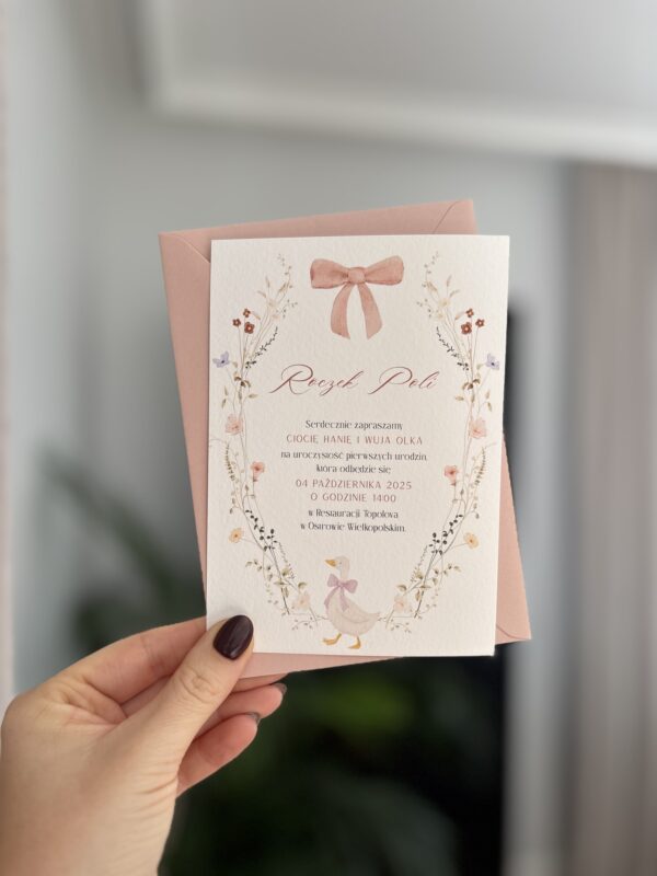 Zaproszenie z uroczą gąską wśród pastelowych kwiatów. Doskonałe dla dziewczynki – delikatne, pełne wdzięku i ciepła.