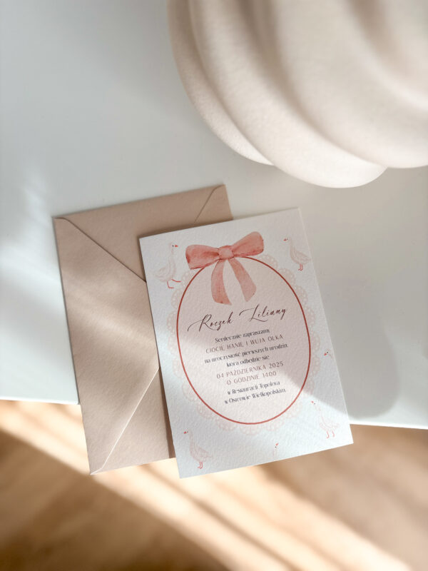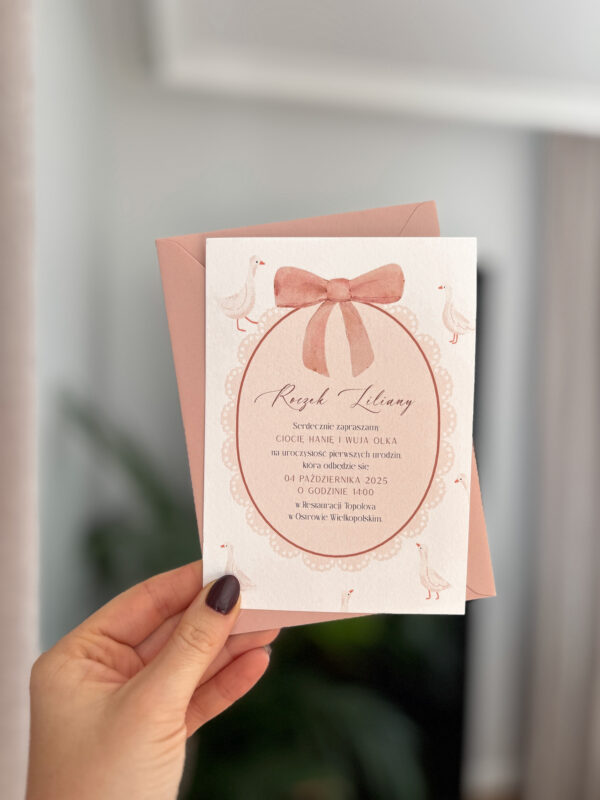 Urocze zaproszenie z motywem gąski w delikatnych odcieniach różu – pełne ciepła i wdzięku. Ozdobione kokardką i subtelną grafiką. Wykonane z dbałością o każdy detal, na eleganckim papierze o przyjemnej fakturze.