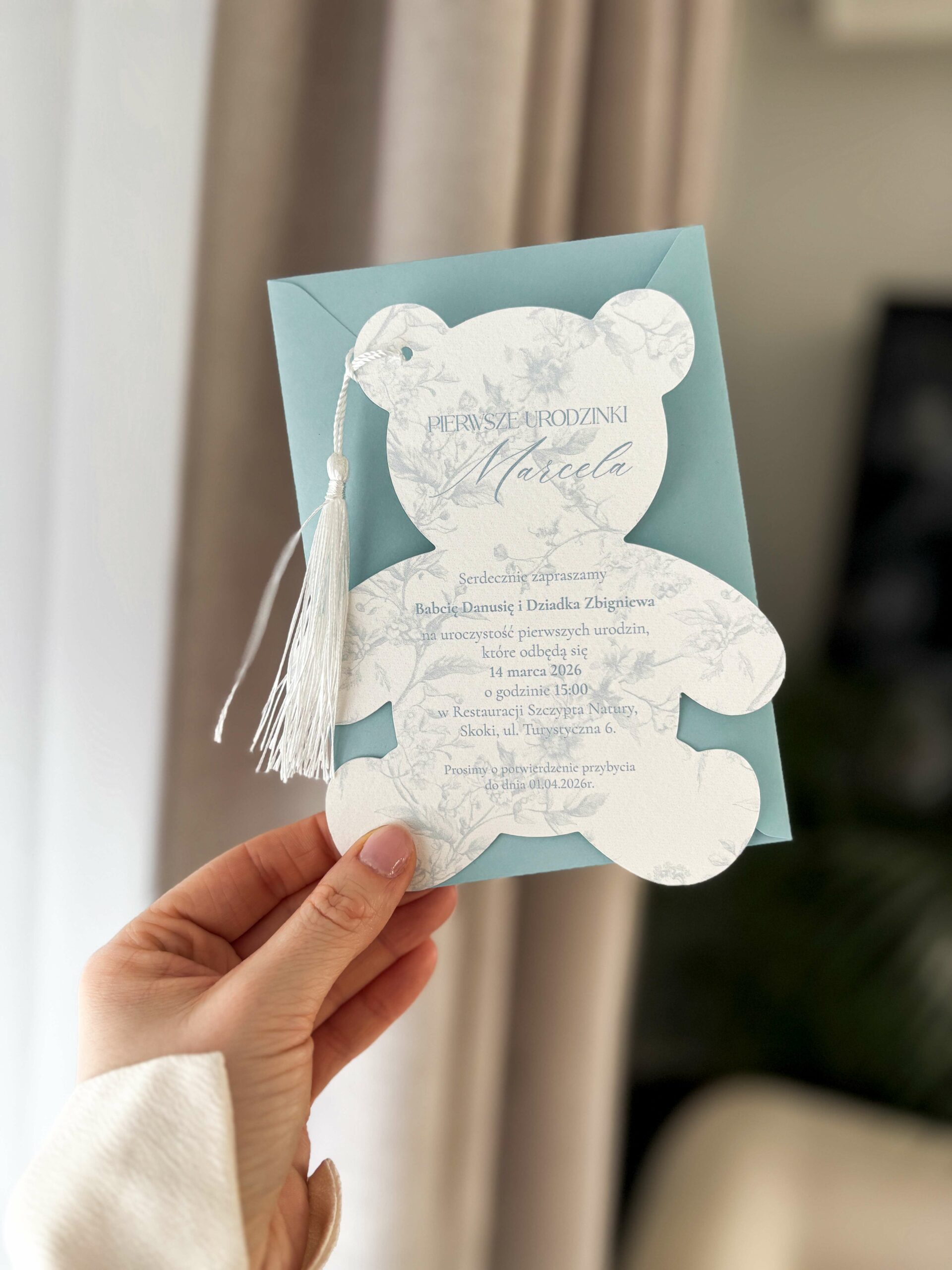Zaproszenie w kształcie misia, utrzymane w delikatnej, pastelowej kolorystyce. Ozdobny chwost dodaje całości wyjątkowego charakteru.
